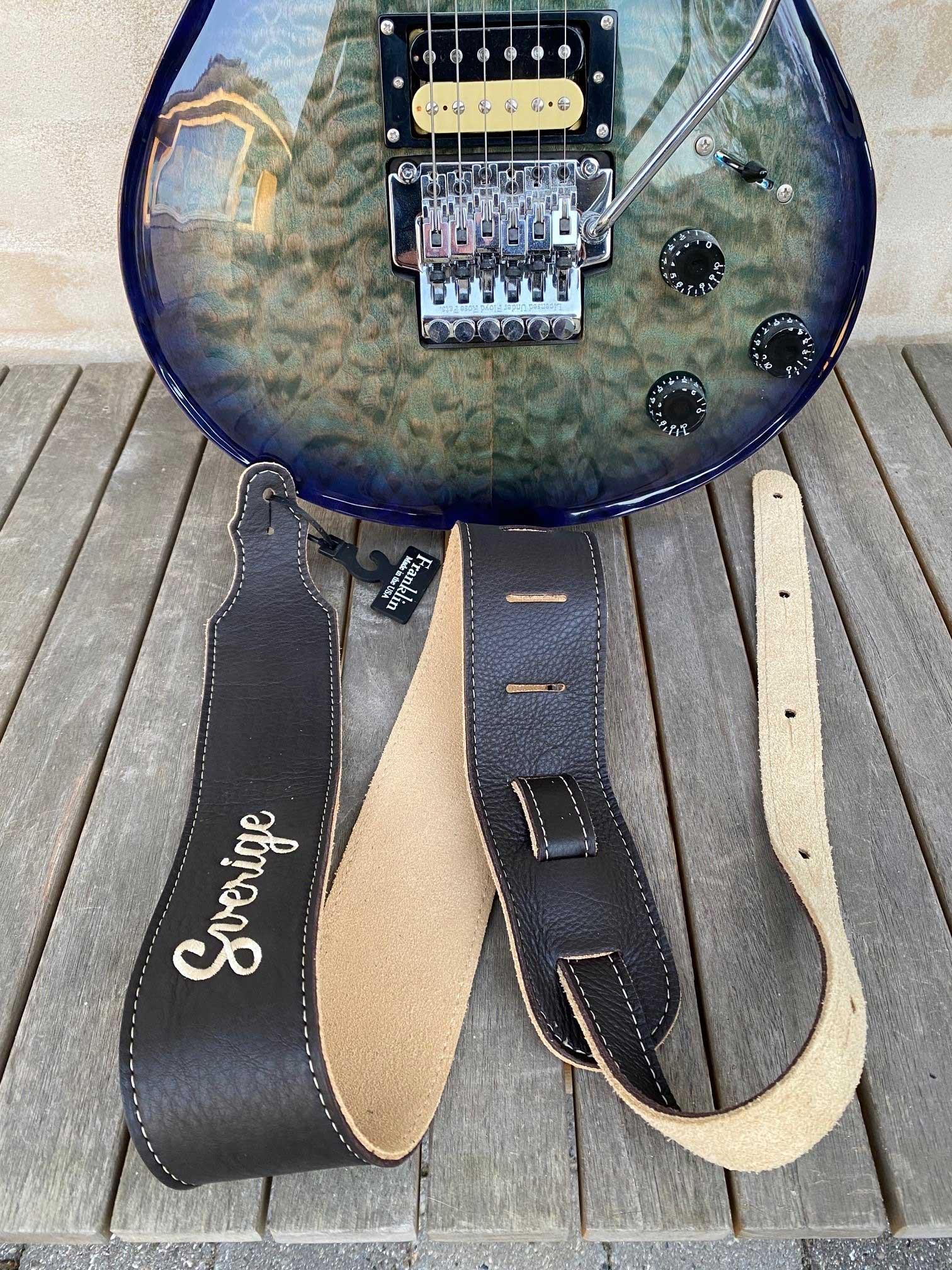 Special designet guitar rem med bogstaverne "SVERIGE" broderet ned i det brune læder
