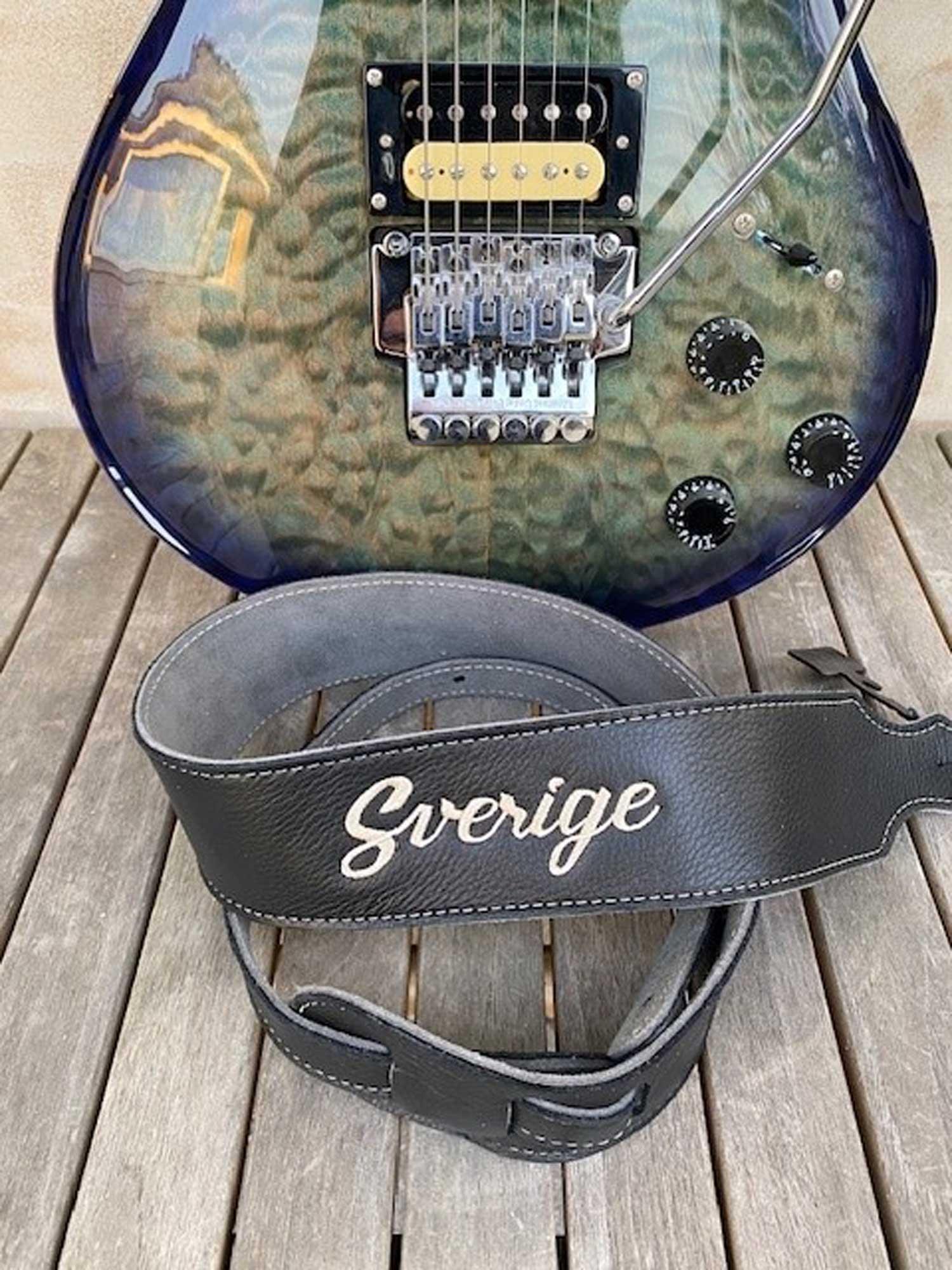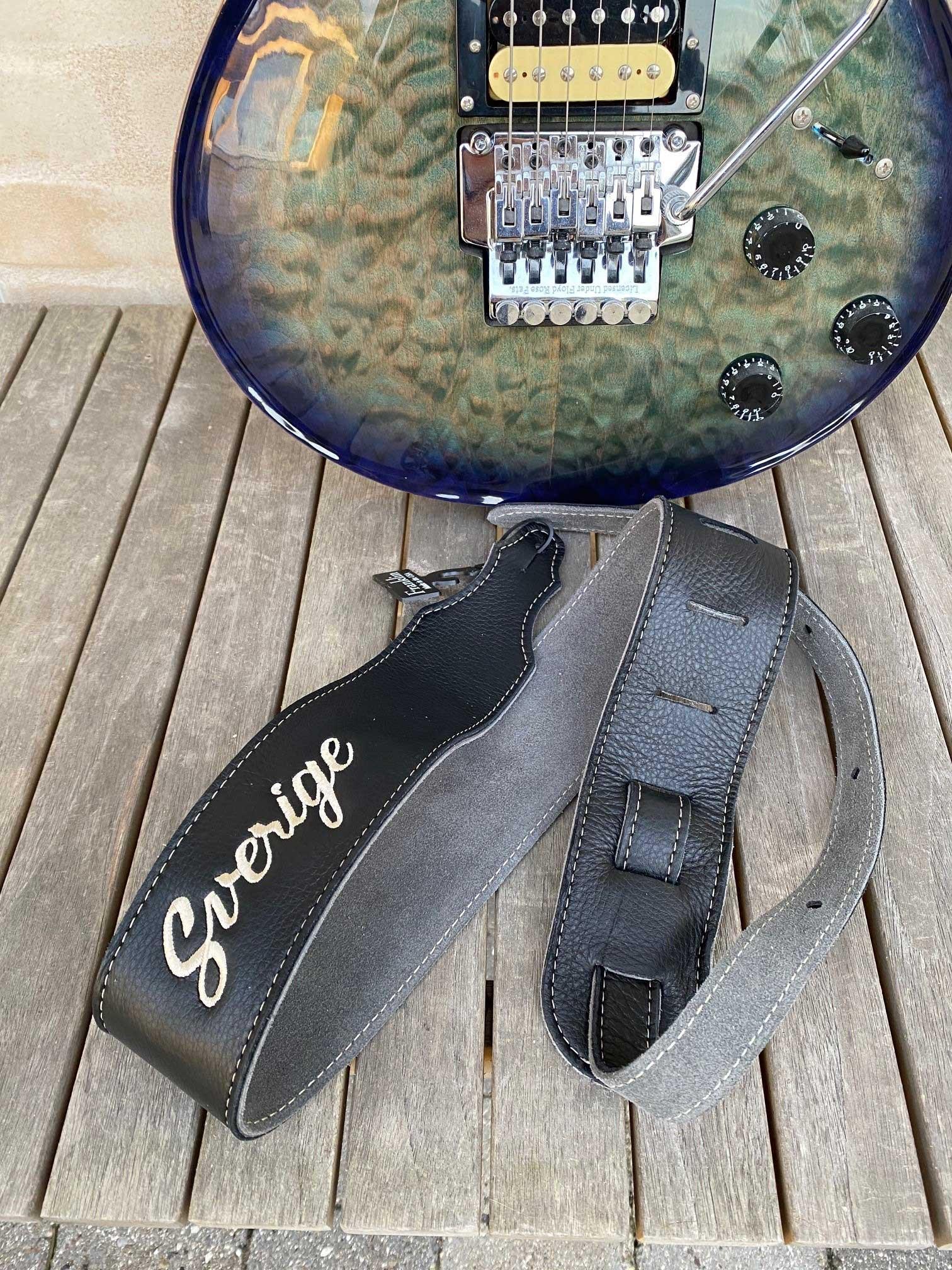 Special designet guitar læder rem med bogstaverne "SVERIGE" broderet ned i læderet
